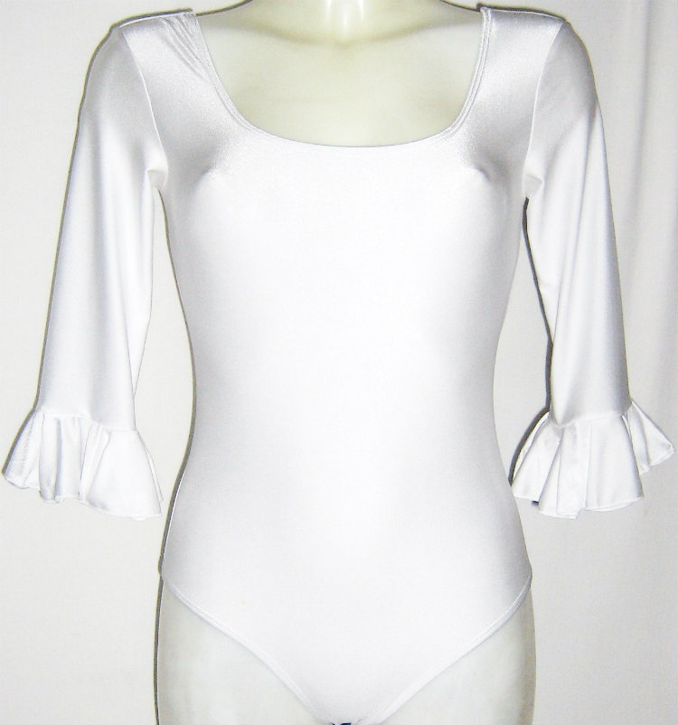 Woman bodysuit for dancing, in spandex polyester. Easy to maintain. 3/4 arm finished by ruffles.